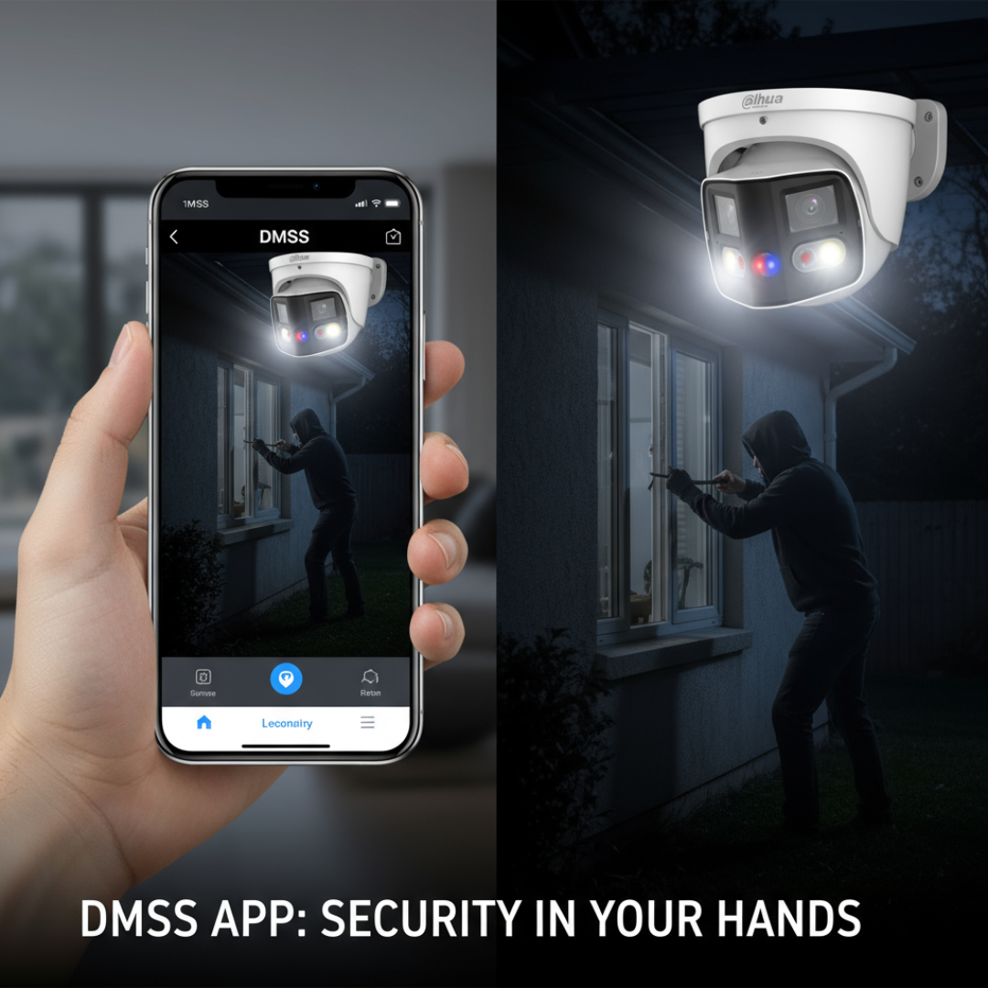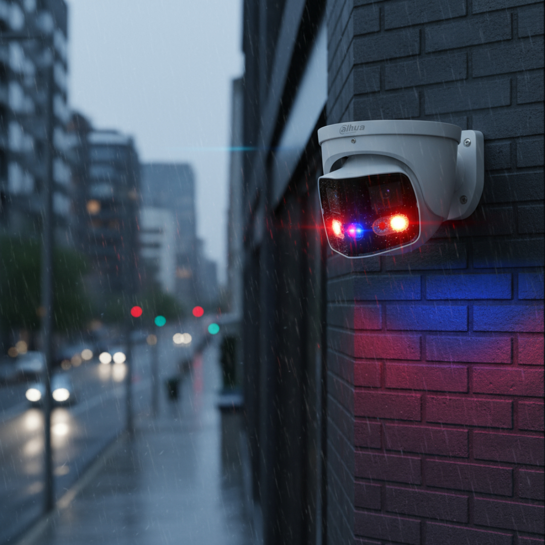 Its integrated active deterrence system combines powerful red and blue warning lights with sirens, effectively scaring off intruders in real time. The camera features Starlight technology and a large aperture fixed-focal lens that ensures vivid, full-color visuals even in low-light conditions, while dual lighting (IR and warm light) supports clear night vision up to 25 meters.